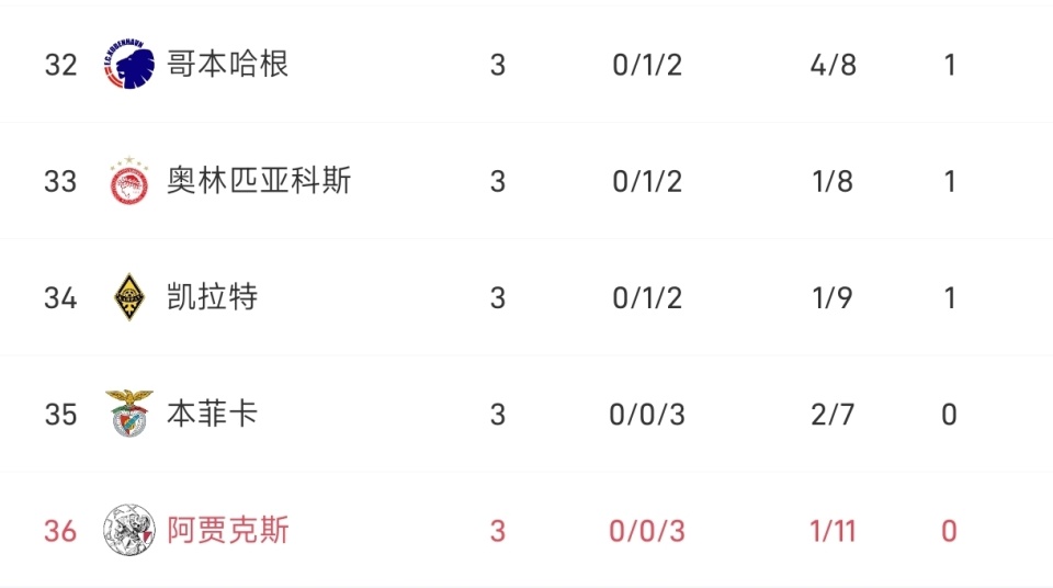 四冠王阿贾克斯时隔三年重返欧冠,目前一胜难求排名倒数第一